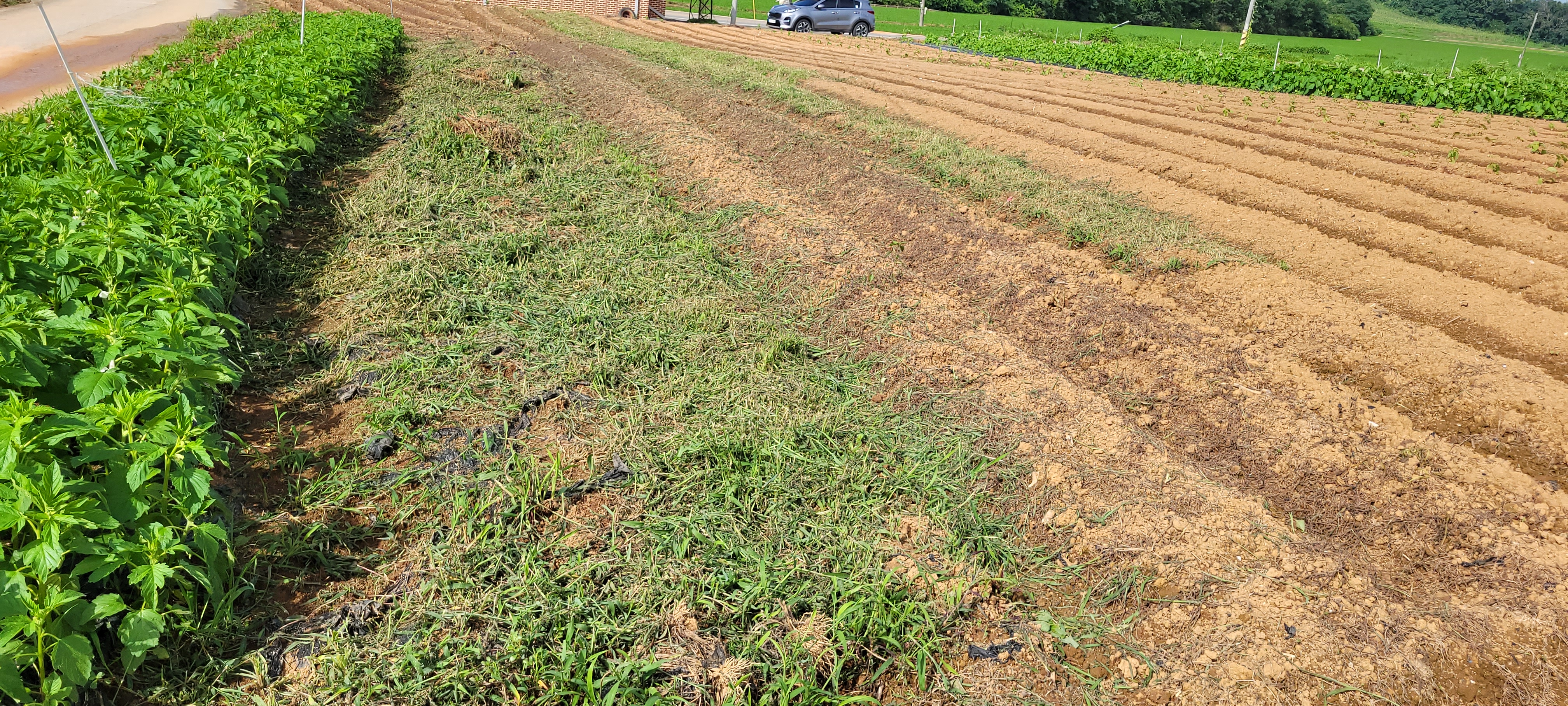 참깨심은좌우에 들깨심기위해 좌측은 제초제(상장군)살포, 우측은 빙초산(3리터 물17리터혼합) 살포후 제초제 살포한곳은 풀이죽었으나 빙초산 살포한곳은 다시 풀이 자람