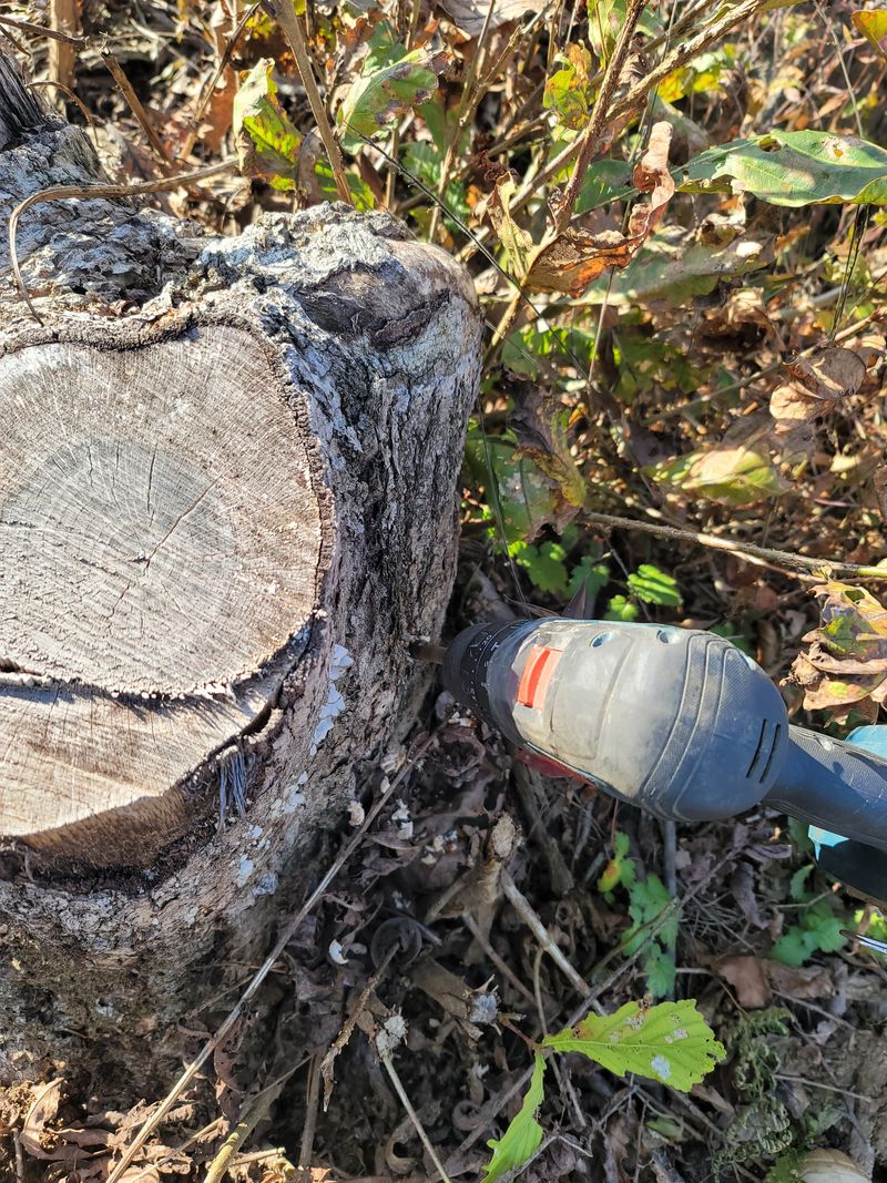 아카시,참나무등의 맹아 제거작업.드릴로 구멍을 뚫고 제초제 주입.